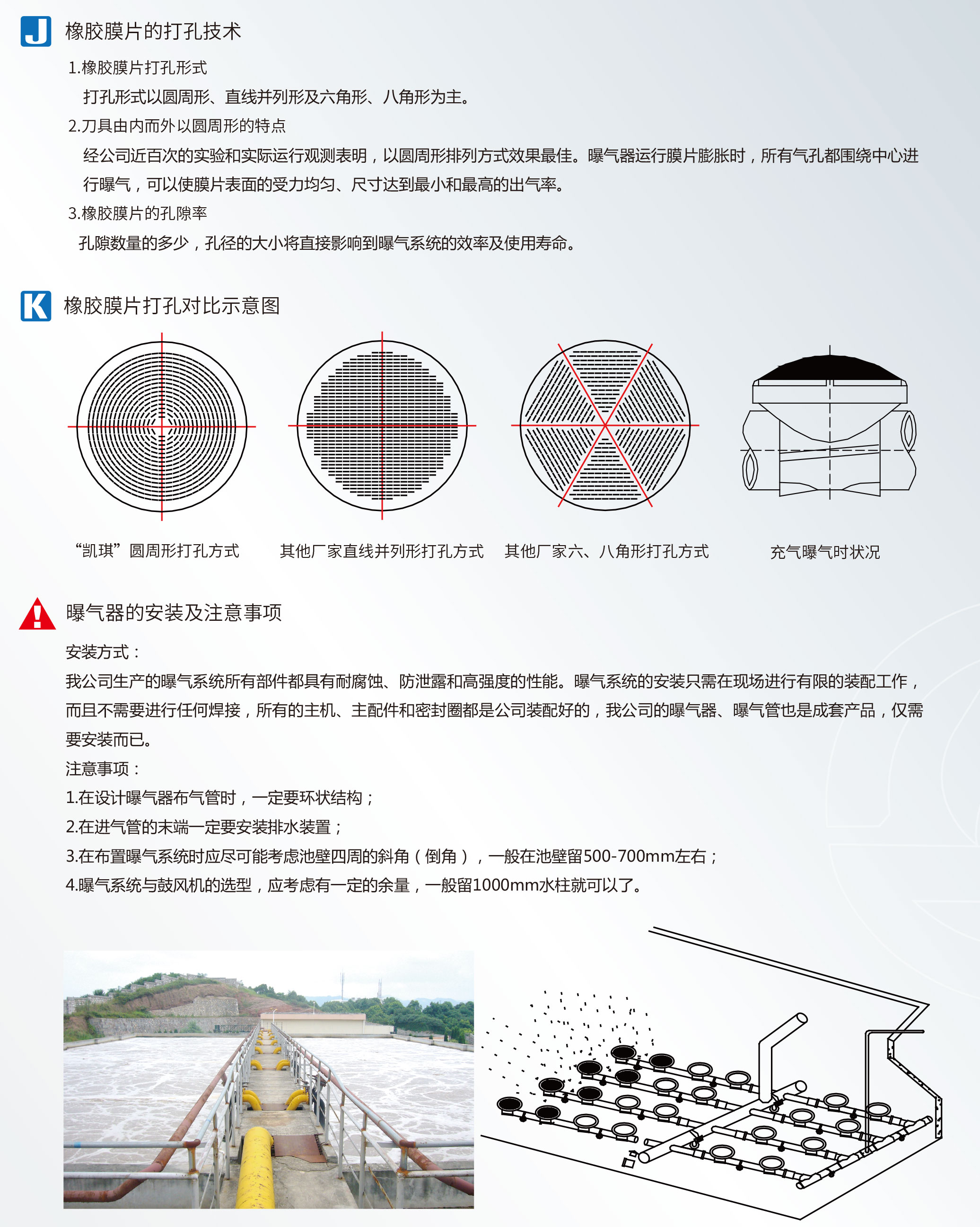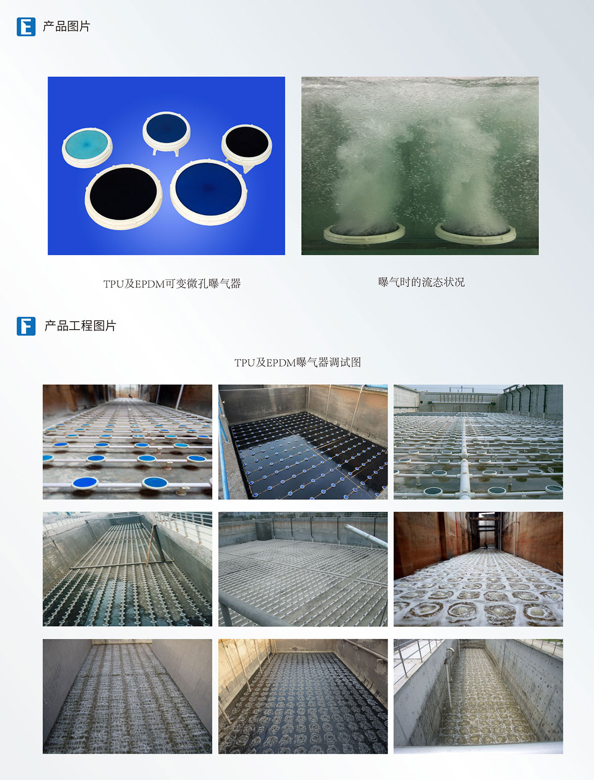 在充氧曝氣時,布氣板上的可變微孔在氣體的作用下能自行膨脹且微孔撐開,以確保氣體從微孔中通過,在靜止狀態下,布氣板上的可變微孔呈封閉狀態。由于可變微孔的自行擴張和收縮,避免以往曝氣器微孔受堵現象,其次在曝氣器的底盤設有氣閥裝置,當管道系統停止供氣時阻止混合液進入布氣支管,這樣可避免支管被堵塞,進入的空氣無需特殊過濾,間歇曝氣均不堵塞。