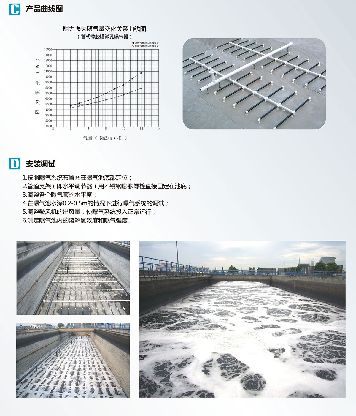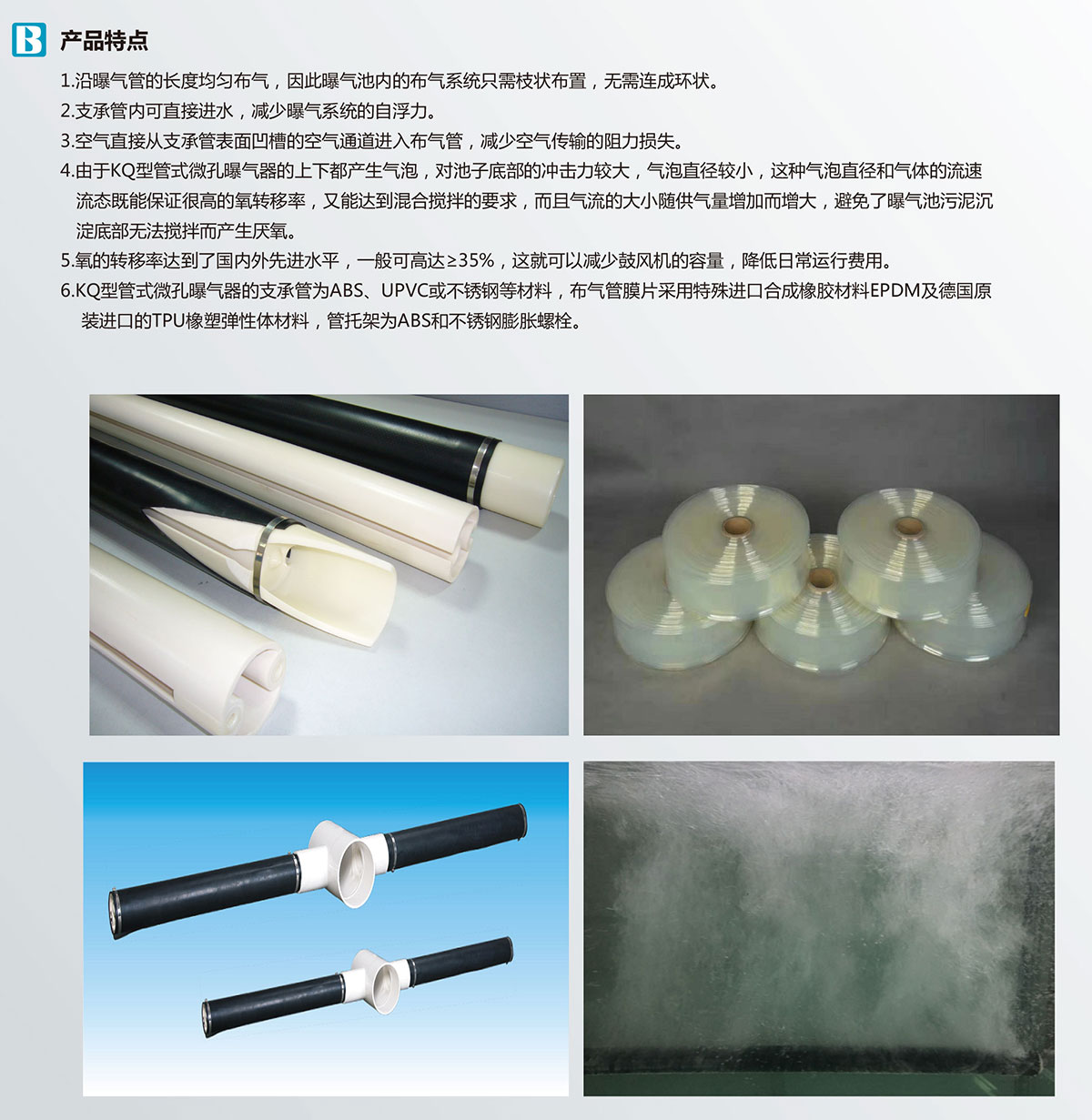 公司在穩定生產可變微孔曝氣器的基礎上,最新開發研制了KQ型管式微孔曝氣器,并獲國家實用新型專利,專利號:20050040241.5。而且還提供所有配套的管材、管配件及管道水平調節器等。并為客戶提供設計、生產到安裝、調試等最佳質量的產品與服務。